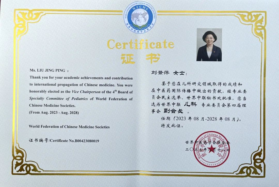 BG大游药业集团党委书记、董事长刘景萍当选世界中医药学会联合会儿科专业委员会第四届理事会副会长